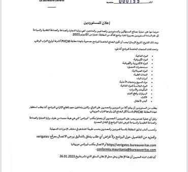 ألزمت وزارة التجارة والصناعة التقليدية والسياحة، التجار، بشهادة مطابقة PVCM لدخول البضائع المستوردة إلى السوق الوطني. و قالت الوزارة إنه اعتبارا من 1يونيو 2023، سيكون جميع التجار مطالبين بإبلاغ الموردين والمصدرين الذين يتعاملون معهم بالطابع الإلزامي لهذه الإجراءات. و حددت في إعلان للستوردين صادر الألاربعاء، البضائع المستوردة التي يجب أن تكون مصحوبة بشهادة مطابقة PVCM…..