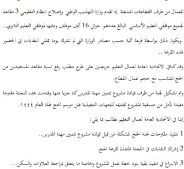 قالت الاتحادية العامة لعمال التعليم إن قطاع التعليم من أكثر قطاعات الوظيفة العمومية عمالا وأقلها استفادة من فرص الحج، مطالبة برفع نسبة المستفيدين من الحج لتتناسب مع حجم عمال القطاع. وأضاف بيان صادر عن الاتحادية أن عمال قطاع التعليم يقدرون بنحو 16 ألف موظف، بينما يستفيدون من 3 فرص للحج سنويا على مستوى قطاع…..