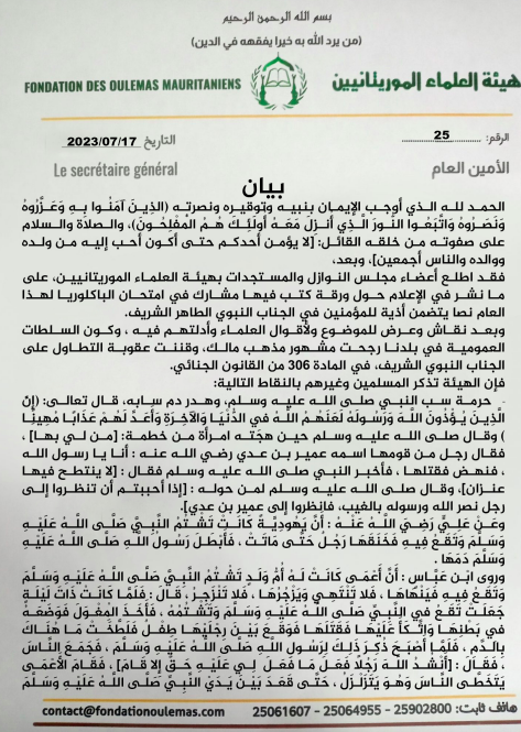 طالبت هيئة العلماء المورتانيين، بقتل صاحب(ة) ورقة امتحان الباكلوريا المسيئة للجناب النبوي الشريف «إن ثبتت نسبتها إليه»، داعية إلى الابتعاد عن التظاهر والحشد».