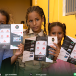 وتحتوي المنشورات الموزعة على نصائح حول كيفية عبور الطريق بسلامة وطريقة ركوب السيارة والنزول منها، إضافة لرسوم مناسبة لمستوى فهم الأطفال المستهدفين.