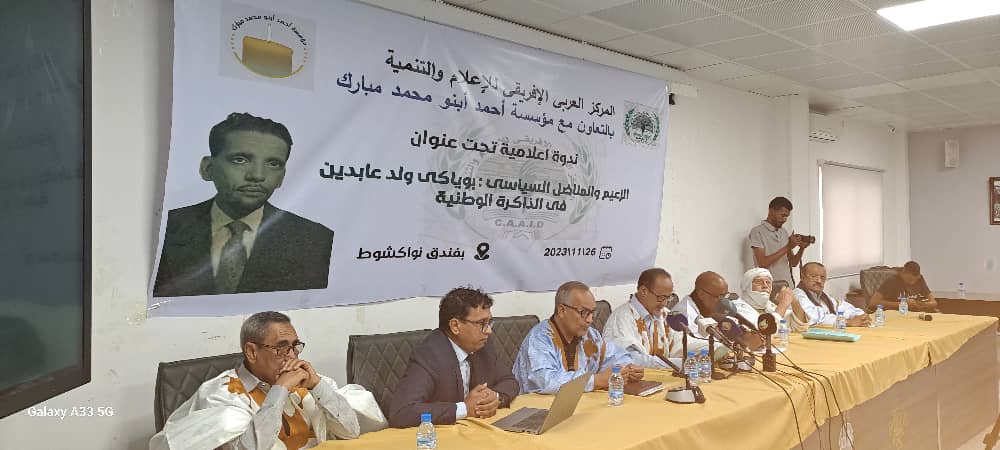 نظم المركز العربى الإفريقى للإعلام والتنمية بالتعاون مع مؤسسة أحمدو أبنو محمد امبارك التى يرأسها الدكتور بدي ولد أبنو ندوة إعلامية تحت عنوان: “المناضل والزعيم السياسى بوياكى ولد عابدين.. فى الذاكرة الوطنية”.