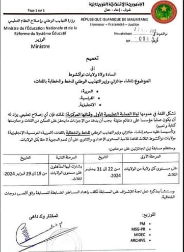 أعلنت وزارة التهذيب الوطني وإصلاح النظام التعليمي، اليوم الأحد، استحداث جائزتين للخط والخطابة خاصة بتلاميذ التعليم الإعدادي والثانوي، في ولايات نواكشوط الثلاث.