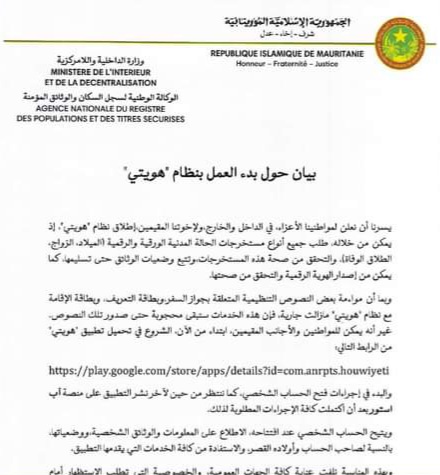 “يسرنا أن نعلن لمواطنينا الأعزاء، في الداخل والخارج، ولإخوتنا المقيمين، إطلاق نظام “هويتي”، إذ يمكن من خلاله، طلب جميع أنواع مستخرجات الحالة المدنية الورقية والرقمية (الميلاد، الزواج، الطلاق الوفاة)، والتحقق من صحة هذه المستخرجات، وتتبع وضعيات الوثائق حتى تسليمها، كما يمكن من إصدار الهوية الرقمية والتحقق من صحتها.