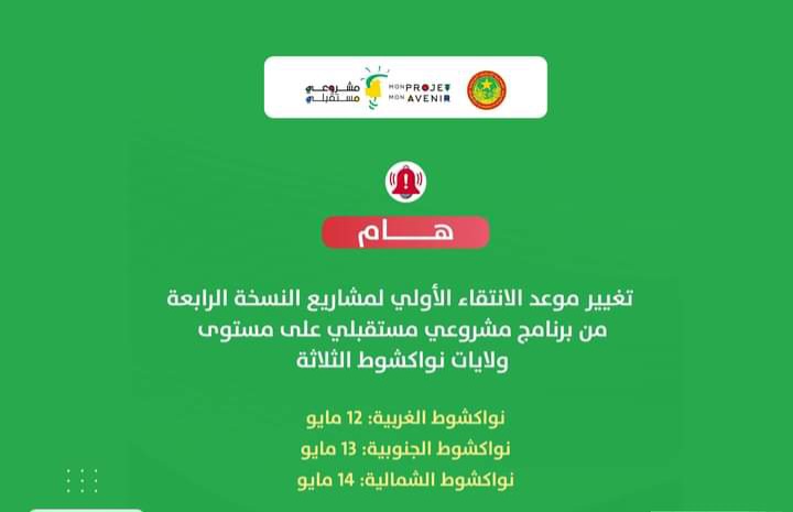 أعلنت وزارة التشغيل والتكوين المهني تغيير موعد الانتقاء الأولي لمشاريع النسخة الرابعة من برنامج مشروعي مستقبلي على مستوى ولايات نواكشوط الثلاثة.