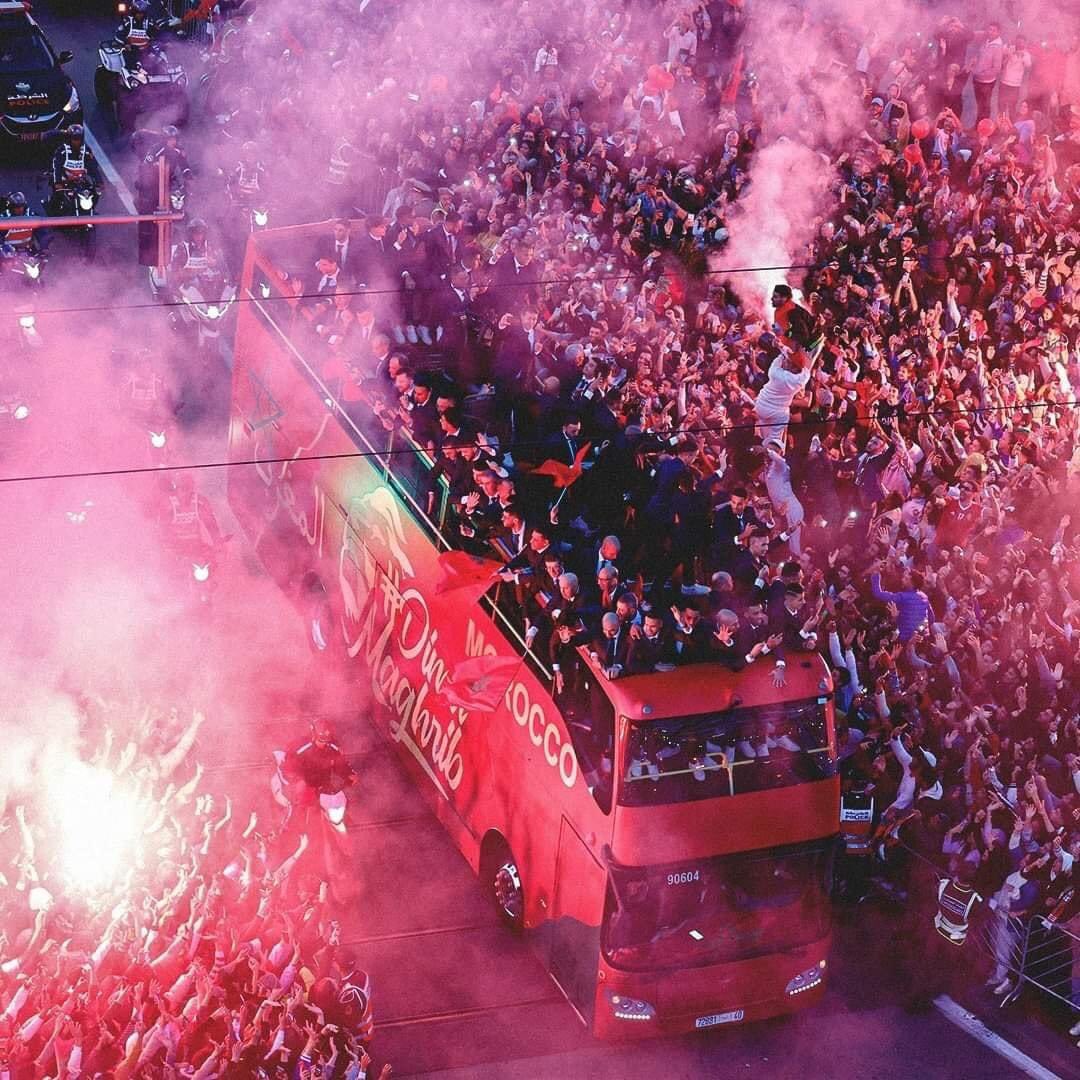 وقد ركب أسود الأطلس بعد وصولهم مطار الرباط – سلا، حافلة مكشوفة جابت مختلف شوارع العاصمة، وسط هتافات شعبية، وأجواء احتفالية كبيرة، تم تجنيد أزيد من 8 ألاف عنصر أمن من أجل تأمينها.