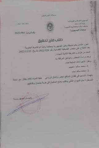 26 ديسمبر 2022 وكيل الجمهورية في ولاية نواكشوط الجنوبية يأمر بوضع طبيبين تحت المراقبة القضائية وجه وكيل الجمهورية في ولاية نواكشوط الجنوبية عثمان ياتم ابنيجك تهمة «التسبب في فقدان المنافع العشر والشلل الرباعي» لطبيبين موريتانيين. ويتعلق الأمر بكل من مدير مصحة النجاح الدكتور الجراح محمد سالم ولد احبيب، والعامل بالمصحة ذاتها الدكتور المخدر محمد سالم ولد باب. وبعد إحالتهما إليه واستجوابهما، أمر قاضي التحقيق بوضع الطبيبين تحت المراقبة القضائية وحجز جوازي سفرهما. وتعود الحادثة إلى عملية جراحية أجريت لمريض بمصحة النجاح لاستئصال المرارة، و لكنها تسببت في ما وصفه ذوو المريض ب: “الموت السريري” لابنهم. و قد تقدم محمد فاضل سيدي محمد، وهو والد المريض، بشكوى ضد الطبيبين عن طريق مكتب المحامي محمد المامي ولد مولاي اعلي. أخبار محلية redaction1a