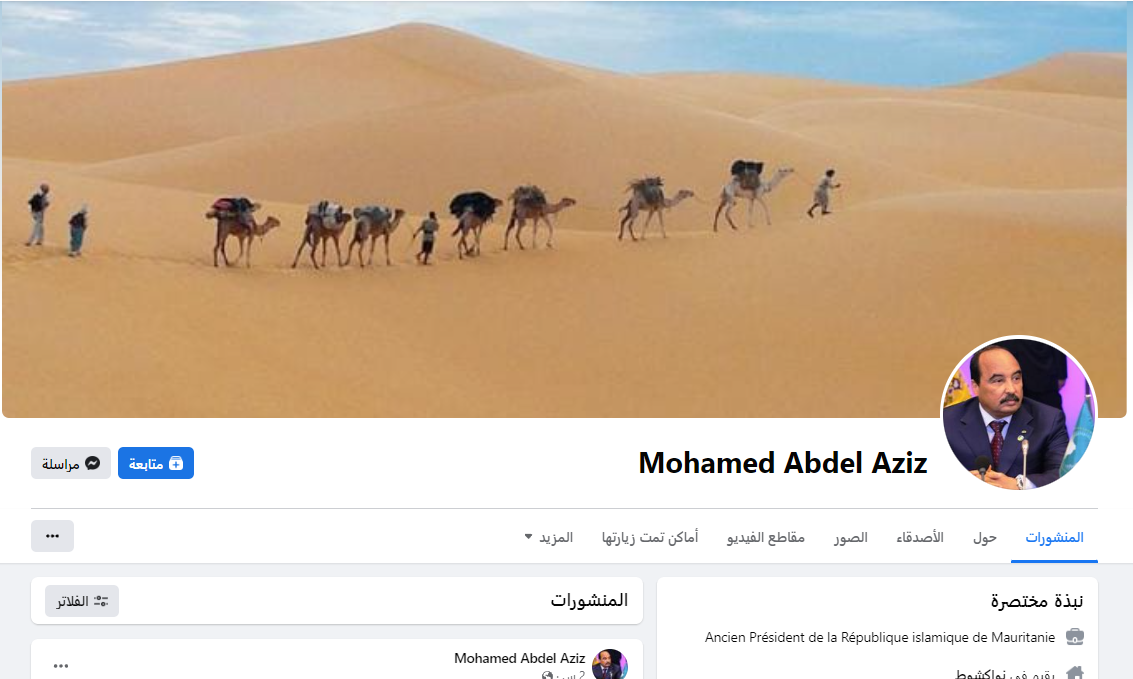أعلن الرئيس السابق محمد ولد عبد العزيز إعادة تنشيط حسابه على فيسبوك من أجل إطلاع الجمهور، “والمشاركة في التبادلات والمناقشات التي تؤثر على حياتنا اليومية لنا جميعا”.
