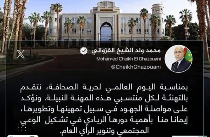 وأكد ولد الغزواني في تغريدة نشرها على منصة “اكس” التزامه بمواصلة الجهود الرامية إلى تطوير مهنة الصحافة وتمهينها، مشيرا إلى الأهمية التي توليها الدولة لهذا القطاع.