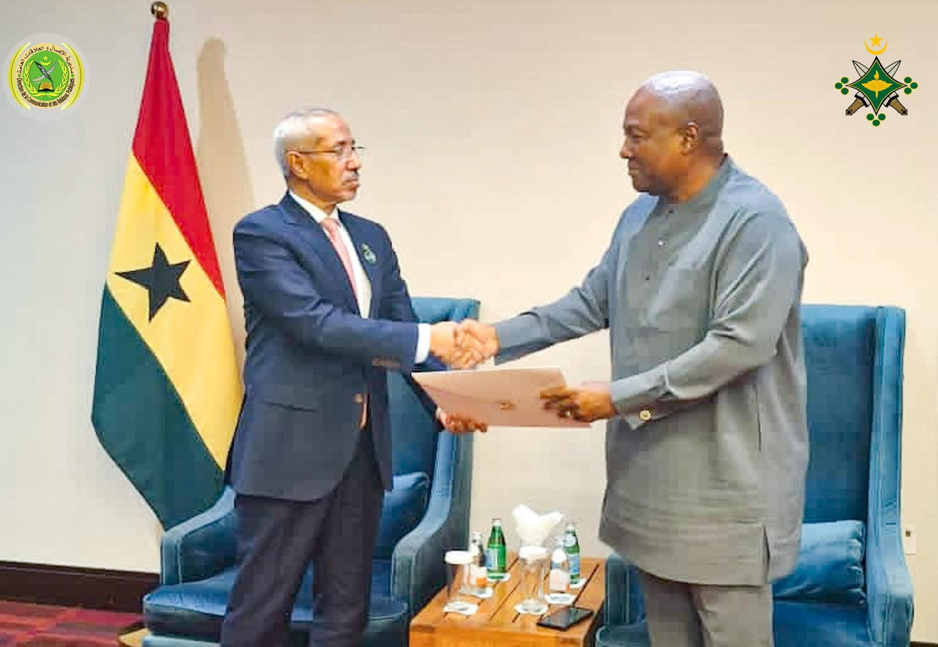 سلّم وزير الدفاع الوطني، حنّن ولد سيدي، يوم الجمعة، رسالة خطية من فخامة رئيس الجمهورية محمد ولد الشيخ الغزواني إلى نظيره الغاني، الرئيس جون دراماني ماهاما.