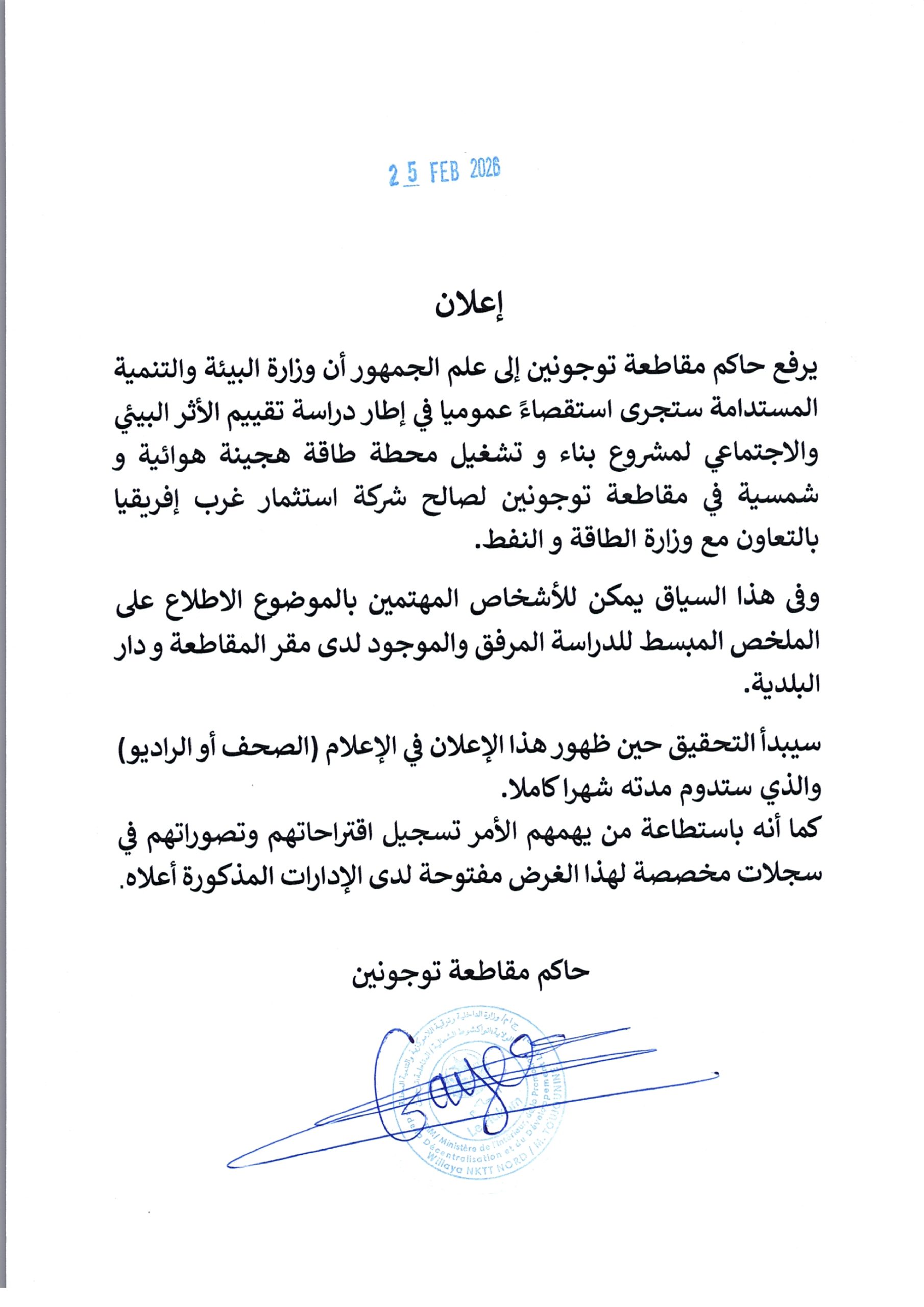 أعلن حاكم مقاطعة توجنين عن تنظيم استقصاء عمومي من طرف وزارة البيئة والتنمية المستدامة، وذلك في إطار دراسة تقييم الأثر البيئي والاجتماعي لمشروع بناء وتشغيل محطة طاقة هجينة تعتمد على الطاقة الهوائية والشمسية بالمقاطعة.