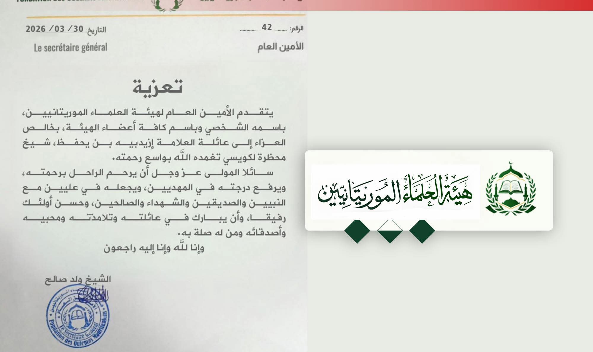 قدّم الأمين العام لهيئة العلماء الموريتانيين، الشيخ ولد صالح، تعازي الهيئة في وفاة العلامة إزيدبيه بن يحفظ، شيخ محظرة لكويشي، الذي وافاه الأجل مؤخرًا.