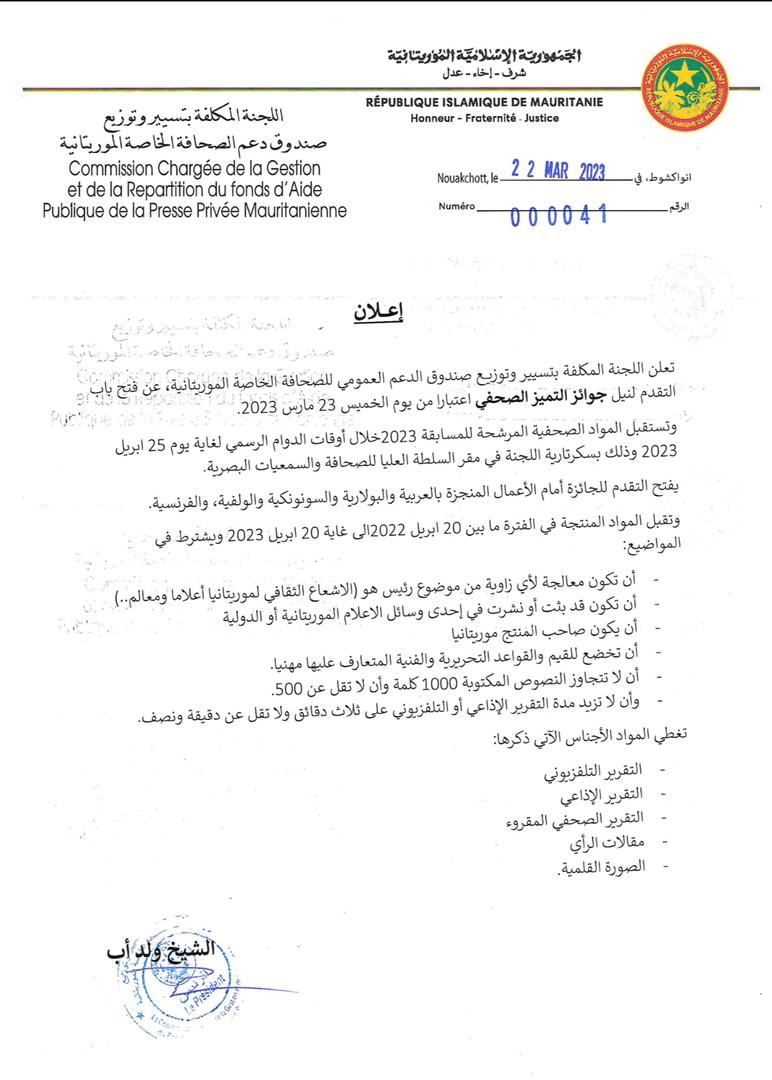 أعلنت اللجنة المكلفة بتسيير وتوزيع صندوق الدعم العمومي للصحافة الخاصة الموريتانية، عن فتح باب التقدم لنيل جوائز التميز الصحفي اعتبارا من اليوم الخميس.