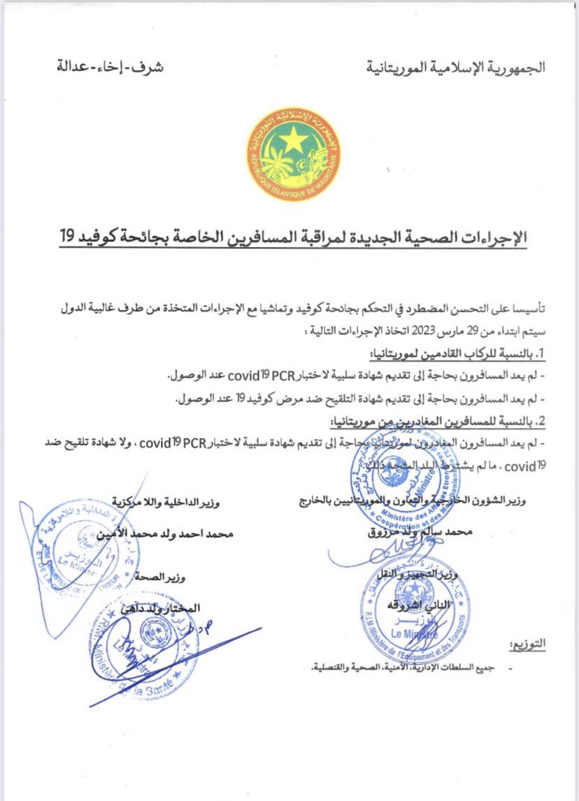 – لم يعد المسافرون المغادرون لموريتانيا بحاجة إلى تقديم شهادة سلبية لاختبار covid19 PCR ، ولا شهادة تلقيح ضد covid19 ، ما لم يشترط البلد المتجه ذلك.