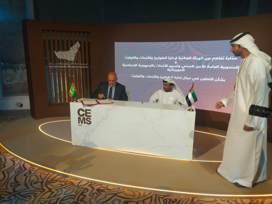 وقعت بلادنا على هامش انطلاق أعمال قمة إدارة الطوارئ والأزمات ـ أبوظبي 2023 ، اليوم، مذكرة تفاهم مع الإمارات، بين المندوبية العامة للأمن المدني وتسيير الأزمات بموريتانيا والهيئة الوطنية لإدارة الطوارئ والأزمات والكوارث بدولة الإمارات العربية المتحدة الشقيقة.