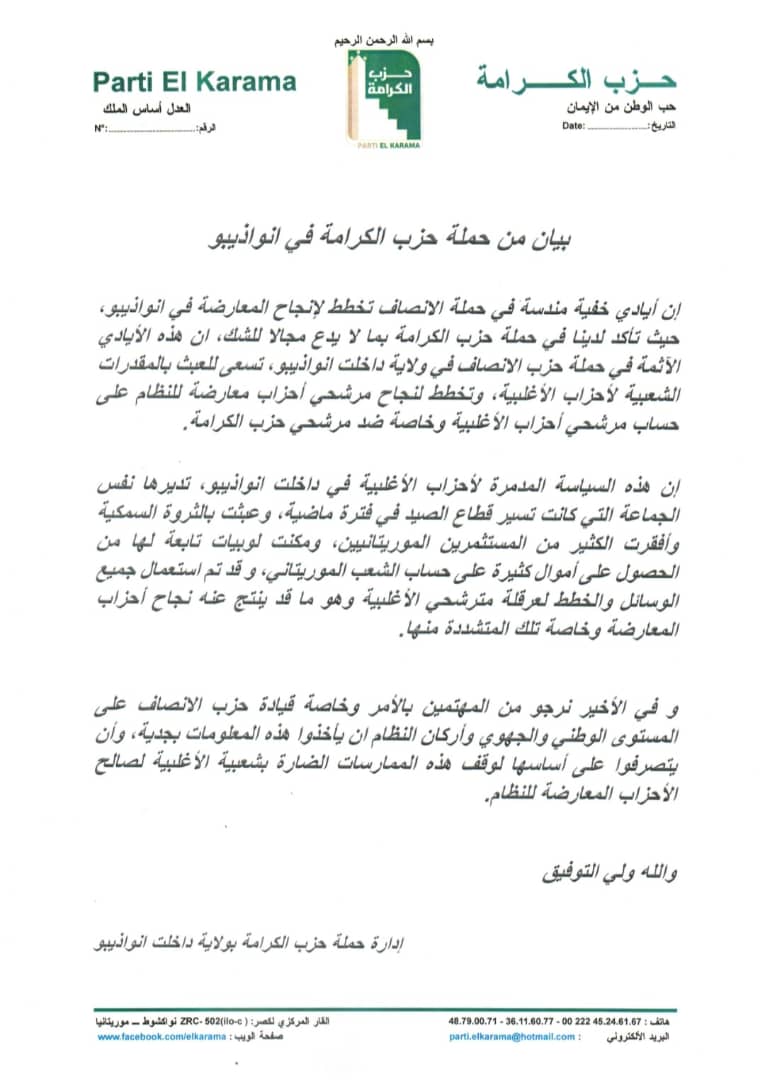 اتهمت إدارة حملة حزب الكرامة على مستوى العاصمة الاقتصادية نواذيبو حزب الإنصاف بالعبث بشعبية الأغلبية ،والتخطيط لإنجاح مرشحي معارضي النظام على حساب مرشحيها حسب قولها.