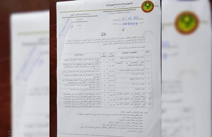 رفعت وزارة التشغيل والتكوين المهني إلى علم الشباب الموريتانيين الحاصلين على شهادة التقني في عام 2022 أو 2023 أن إيداع ملفات الترشح للحصول على تكوين متوسط في المغرب يبدأ اعتبارا من اليوم الثلاثاء، الموافق 4 يوليو 2023 إلى غاية الجمعة 14 يوليو 2023 في مقر المديرية العامة للتكوين التقني والمهني.